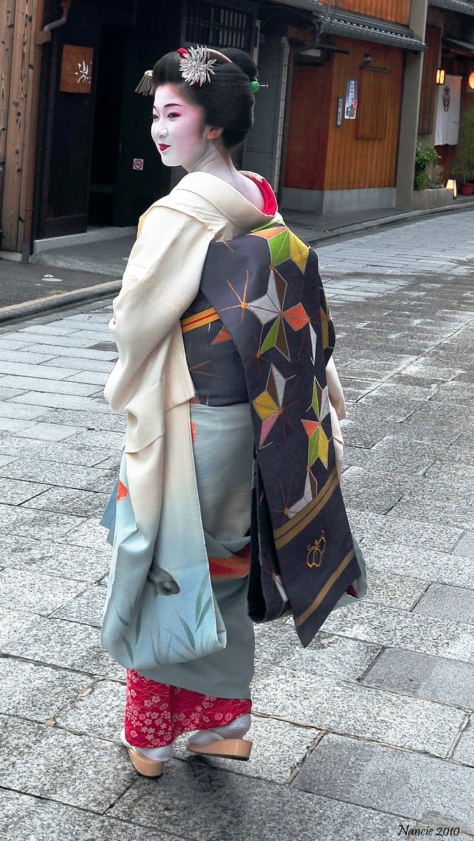 I’ve seen women dressed as traditional Geisha’s in the Gion district. It was hard to know if they were true Geisha’s or had paid a service to dress them. Lovely to see and I can’t imagine those shoes on the cobblestones!