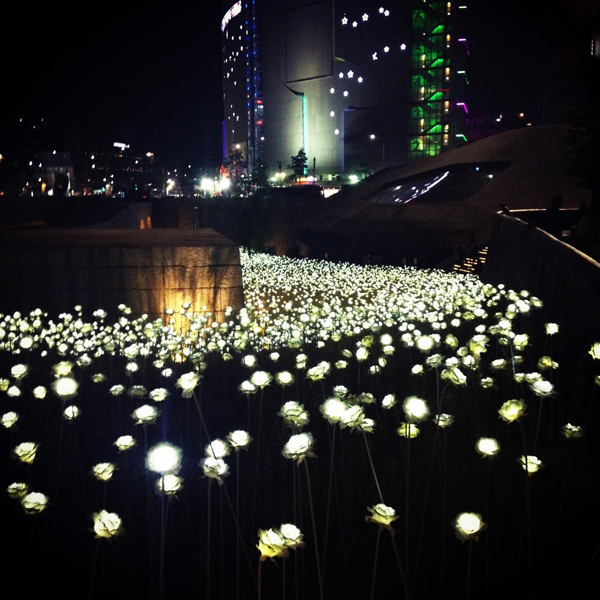 Dongdaemun is famous for its shopping. There are a plethora of department stores that will keep anyone who has a yen for shopping busy for hours. However, the real fun beings after midnight, when clothing and other items are sold in open air markets on the street. That later it is, the better the bargain. However, we were not there for the shopping, but for the history and culture park. We were anxious to see the illuminated rose garden and Andy Warhol. We did manage to finally get to the rose garden, but missed Andy on the first visit. These photo are taken over a two week period, so some night shots and some day shots.