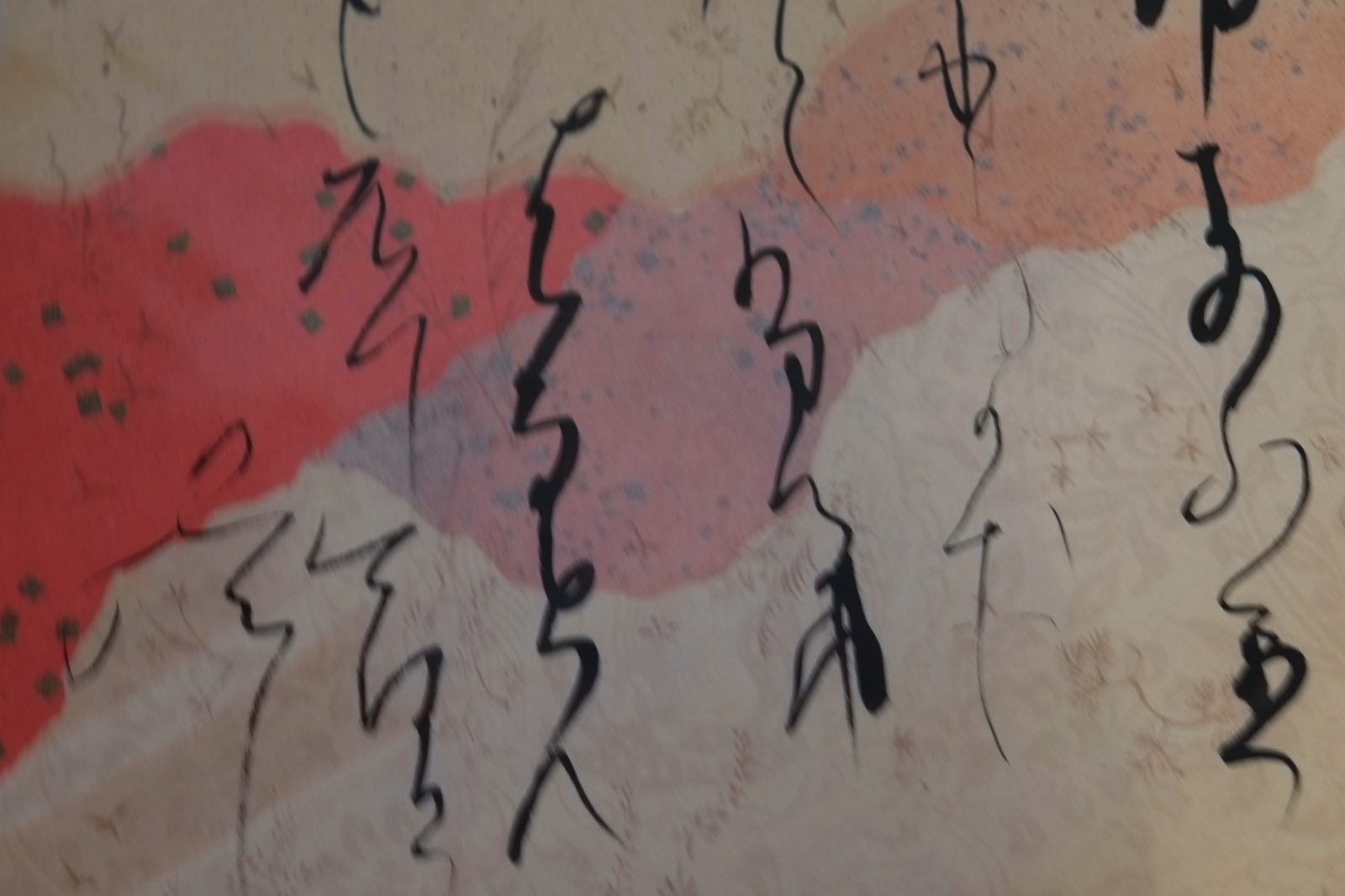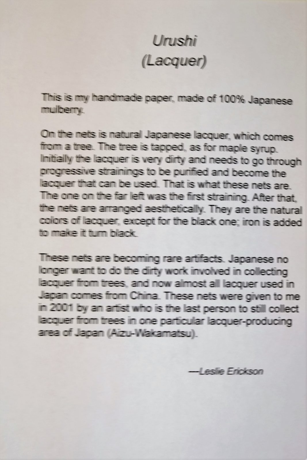 The second gallery is through the French doors on the right. The first time I walked into this room and saw the five pieces displayed on the far wall I stopped in my tracks. I’ve never seen anything quite like them, and I was totally intrigued. What you’re looking at are straining nets with natural raw lacquer (“Urushi”) on them.