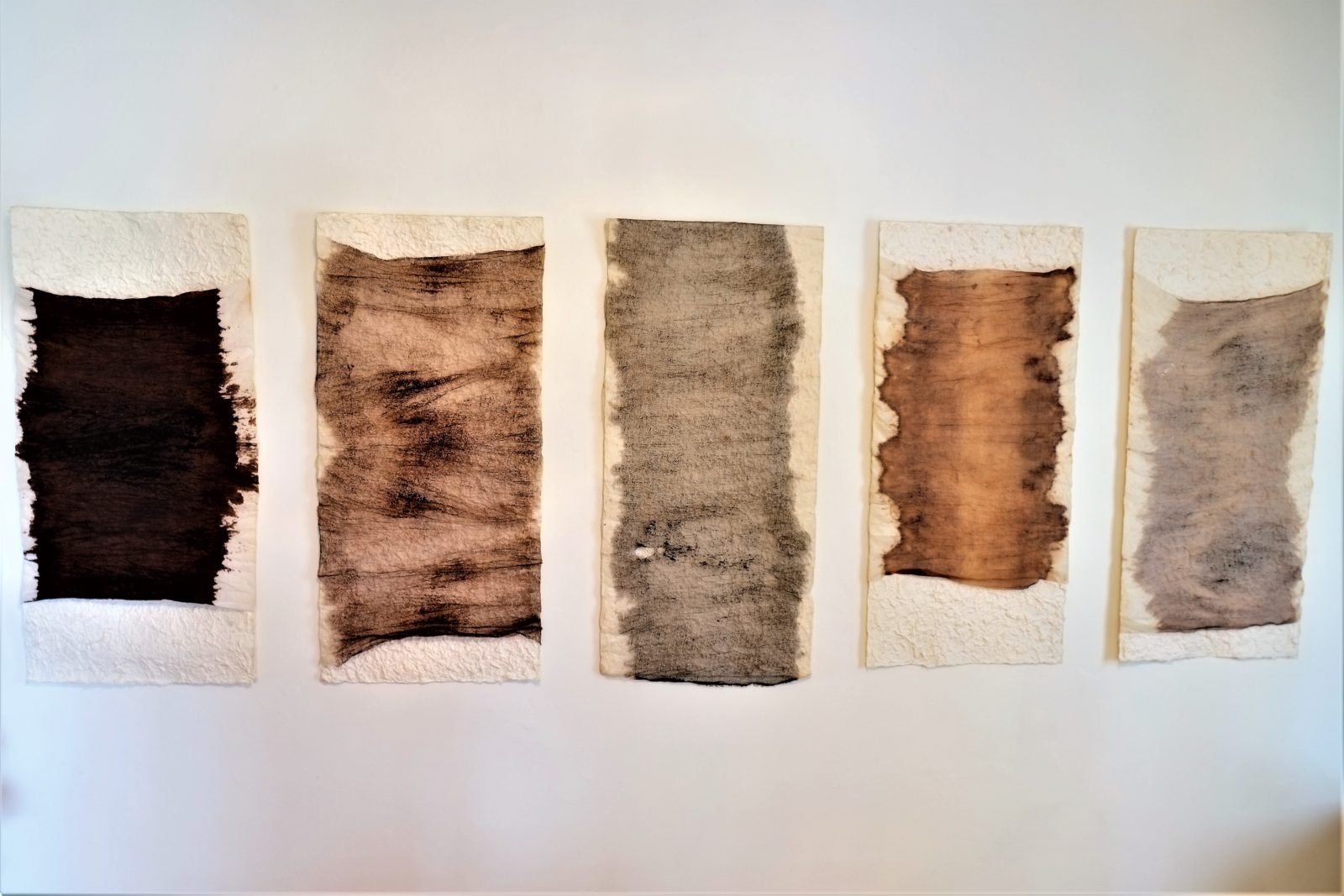 The nets were gifted to Leslie in 2001, and you see them here mounted on her handmade paper, produced from 100% mulberry. I have included Leslie’s story of these works below.
