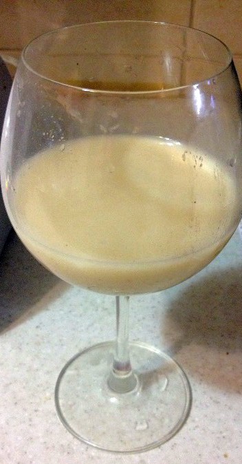 A week later, the finished product! My makgeolli was smooth, with a bit of a tangy after taste.  Usually served in a short, round, pottery cup. Hey, in a pinch, a wine glass always  works.