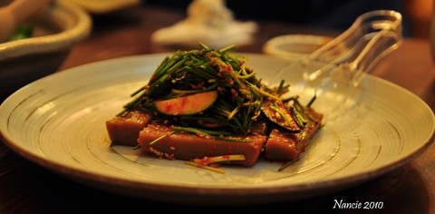 Acorn jelly is often served as a side dish in Korean restaurants. By itself it’s not really that interesting. In this dish with the greens and the sauce it’s quite nice.