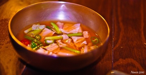 This was a very pleasant dish. What you do with this dish is take a piece of the kimchi the white stuff.