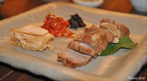 This was a very pleasant dish. What you do with this dish is take a piece of the kimchi (the white stuff),