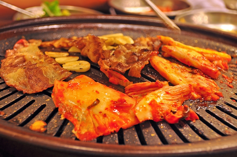 All cooking happens at the table. The beef is cooked over genuine charcoal, which is changed regularly as it cools down. In this shot you can see that we are cooking pork, garlic and kimchi. Yes, grilled kimchi is delicious. I was most impressed with the cuts of beef available. By the time I took this shot taken the beef had disappeared!