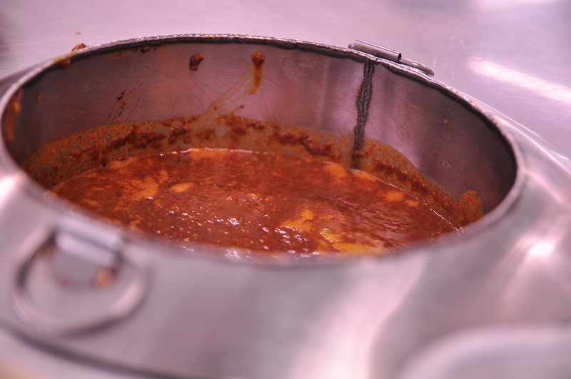 They were doing a brisk business, and by that time my stomach was begging for food. The tables are round, stainless steel, with a hold in the middle to hold the vat of peanut sauce. When you sit the waitress brings the peanut sauce and turns on the flame to get it bubbling.